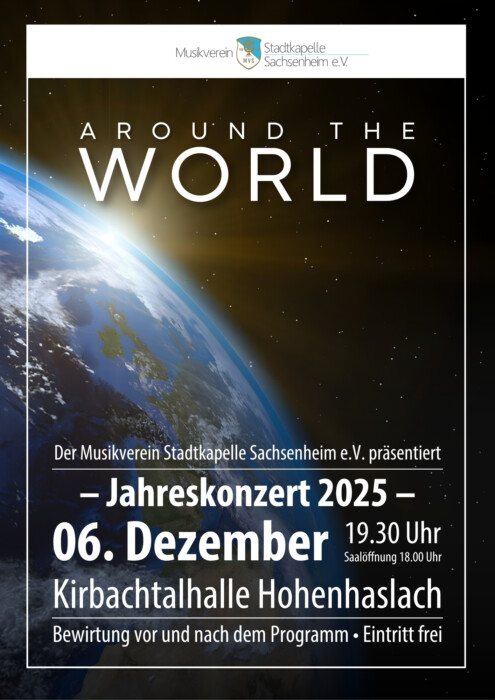 Der Musikverein Stadtkapelle Sachsenheim e.V. lädt zum Jahreskonzert 2025 ein. Das Konzert findet am Samstag, 06. Dezember 2025, um 19.30 Uhr in der Kirbachtalhalle Hohenhaslach statt. Die Saalöffnung beginnt um 18.00 Uhr. Der Eintritt ist frei, und es gibt eine Bewirtung vor und nach dem Programm.